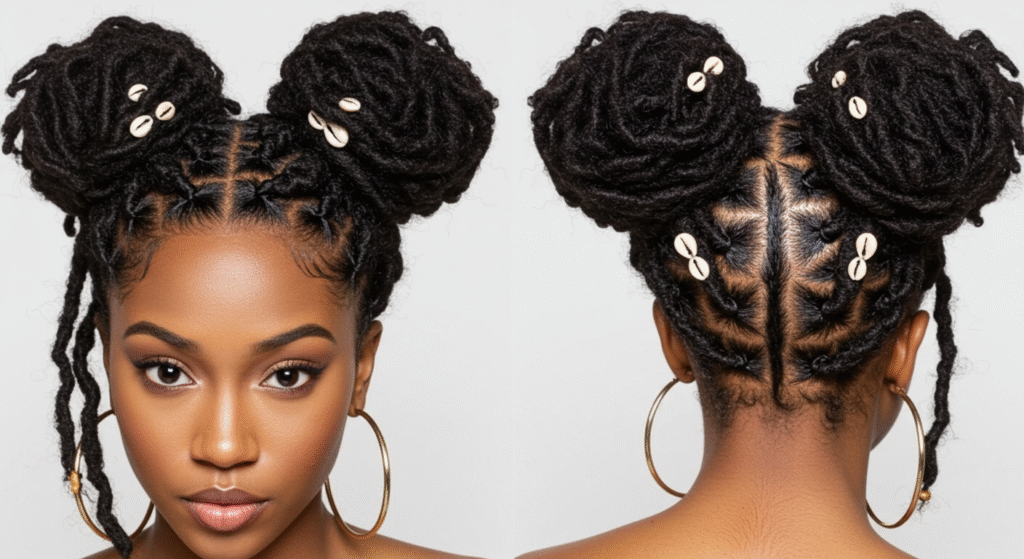 Create a middle part to split your hair into two equal sides. Twist each section at the roots for definition, then gather into high buns. Leave a few locs loose around the face for a soft, framing effect. This versatile style works beautifully with both casual outfits and more dressed-up looks.