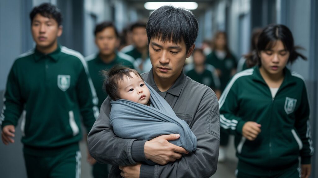 Gi-hun takes on the role of the baby’s protector, fulfilling his promise to Jun-hee. His commitment to the child’s safety becomes his primary motivation for continuing in the competition, even as the challenges become increasingly deadly.